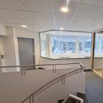 De entreehal en de ontvangstbalie zijn volledig vernieuwd en opnieuw ingedeeld. Door de strategische plaatsing van nieuwe deuren en glazen wanden is een duidelijke scheiding gecreëerd tussen het publieke gedeelte en de interne werkruimtes, wat de controle op de bezoekersstroom optimaliseert.