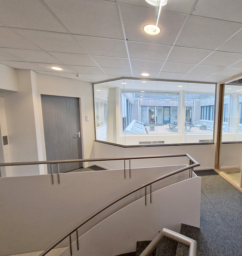 Het callcenter, de reproruimte en de raadszaal zijn grondig aangepakt. In de raadszaal is gekozen voor duurzame kozijnen en deuren van Yellow Poplar. Bijzonder detail is de toepassing van switchfolie op de ruiten van de raadszaal, waardoor deze met één druk op de knop kunnen schakelen tussen mat en helder glas.